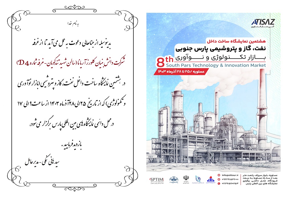 Klevers Aryana Knowledge-Based Company (D4) proudly announces its participation in the 8th Domestic Manufacturing Exhibition for Oil, Gas, and Petrochemicals – South Pars Technology & Innovation Market. This important event will be held from December 15 to 18, 2024 (25–28 Azar 1403) at the Bushehr International Exhibition Center in Asalouyeh.